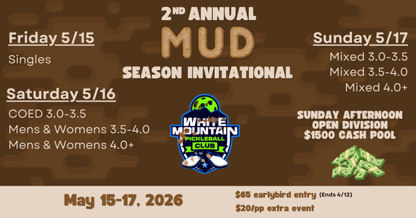 The snow has melted, the trails are muddy, and the competition is heating up! Join us May 15th–17th at White Mountain Pickleball Club for the Mud Season Invitational—a three-day showdown packed with high-level play, fierce rallies, and serious bragging rights.