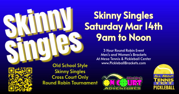 This is a fun, morning round robin 50+ Men's and Women's Skinny Singles Doubles Tournament (non-elimination) by age and skill level. All matches will begin at 9am. Check-in desk opens at 8AM. The tournament will last approximately 3 hours. Medals will be awarded for 1st place, 2nd place, and 3rd place in each bracket. The scores in this tournament will not be reported to DUPR. So Relax, Play and Have Fun!